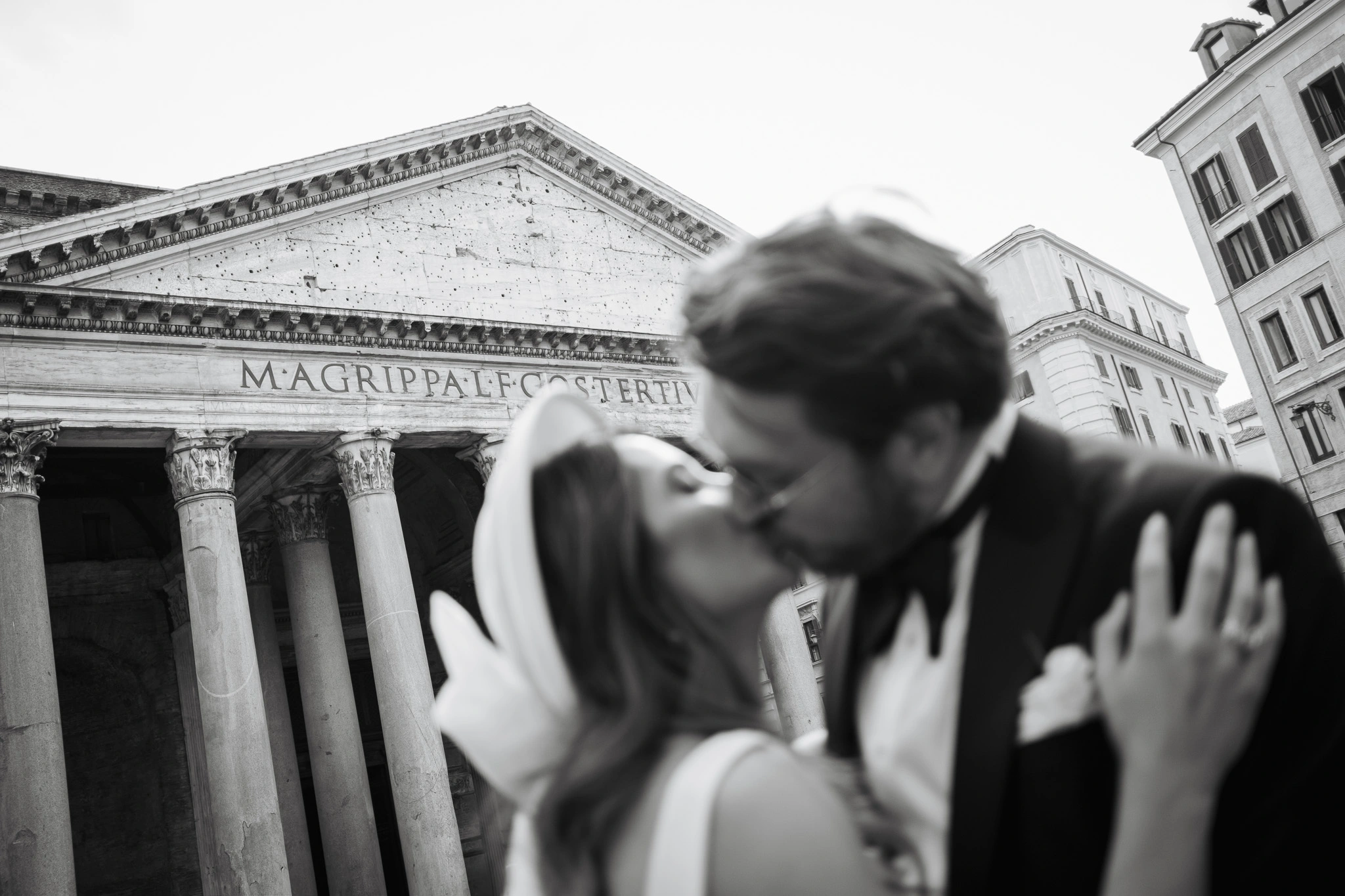 Il Pantheon con la sua armonia classica, le colonnate di San Pietro, o la vista scenografica dal Gianicolo diventano sfondi che esaltano, senza sovrastarla, la coppia al centro della scena.