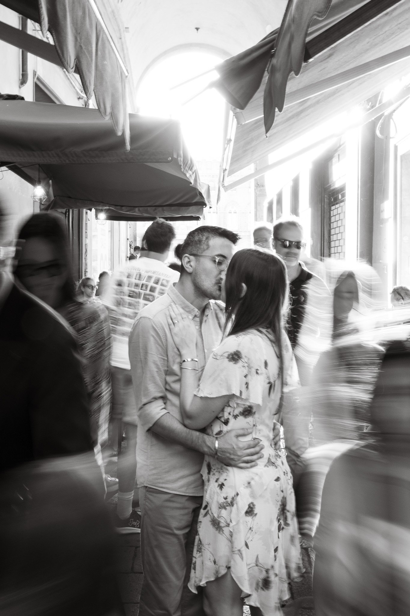 Anche se Lisa e Ahmet sono una coppia piuttosto riservata, quel primo bicchiere di vino ha fatto la differenza. Si sono rilassati velocemente e hanno smesso di preoccuparsi delle persone che li guardavano mentre si baciavano, ridevano e perfino ballavano nelle strade. Sotto gli iconici portici di Bologna, si sono semplicemente lasciati andare alla felicità.