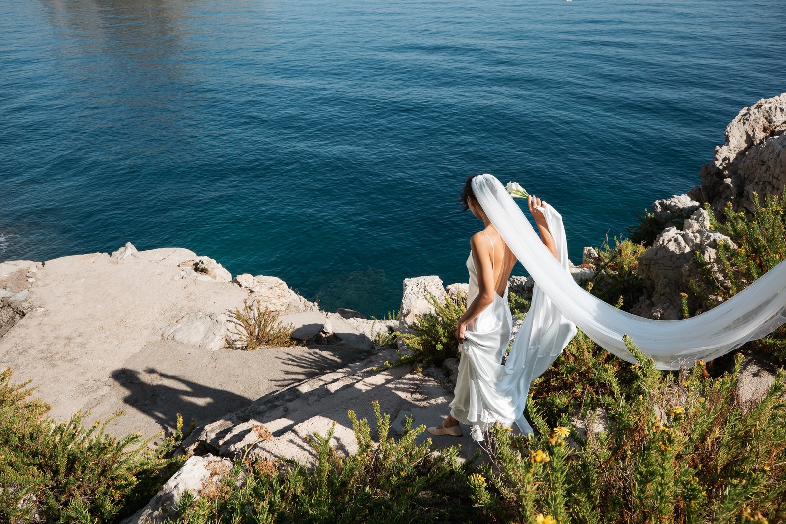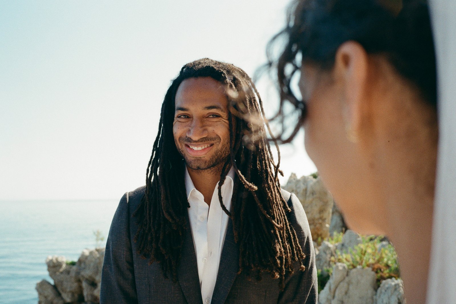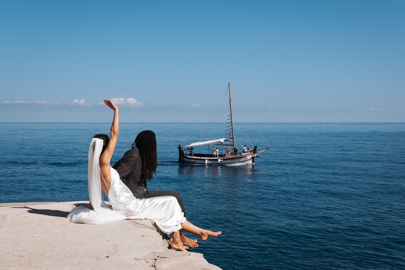 Sono atterrato in Sicilia due giorni prima della cerimonia, per ritrovare la sua luce familiare e il suo tempo lento. Quella sera ho guardato il sole scendere nel mare, tingendo il cielo di rosa e d’oro. Dopo una notte tranquilla mi sono svegliato pronto per l’intima celebrazione di Rae e Matthew a Sant’Elia, uno di quei luoghi sul mare che sembrano esistere fuori dal tempo.