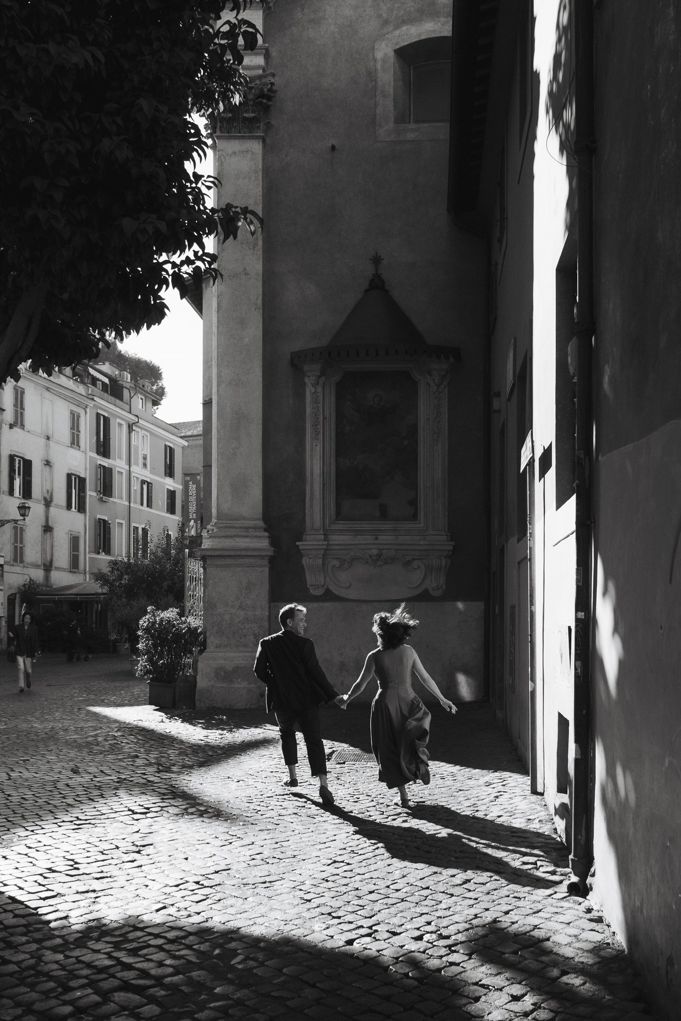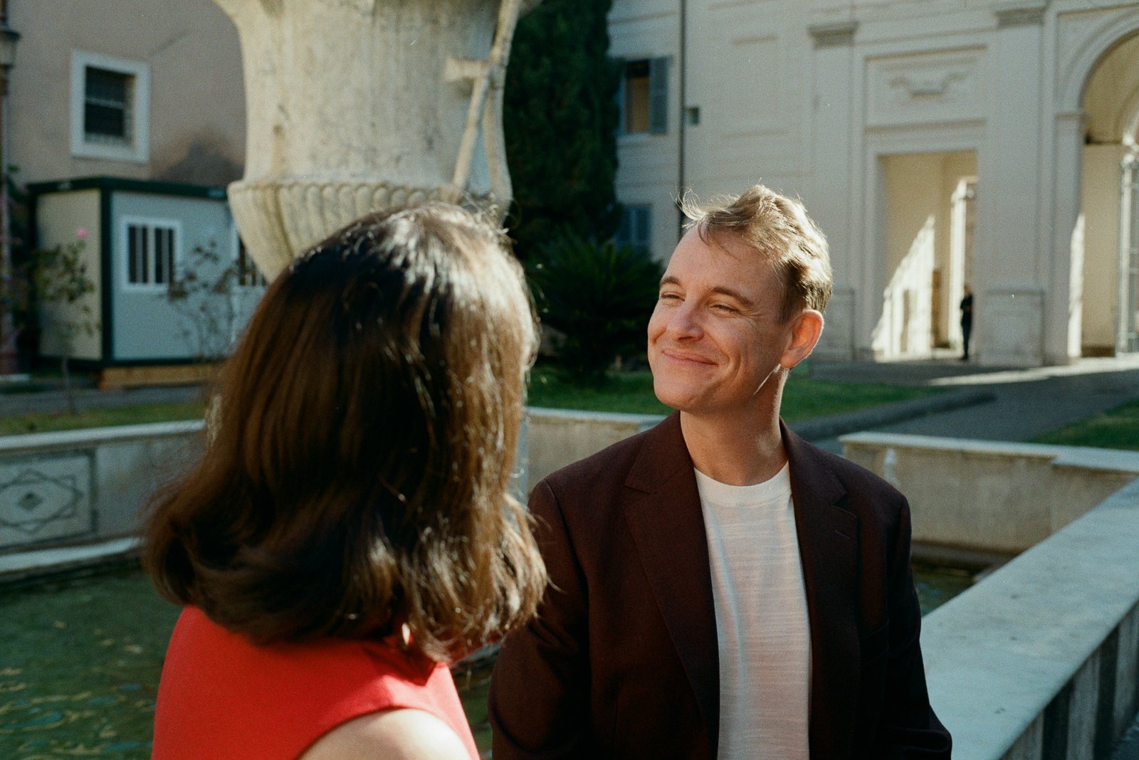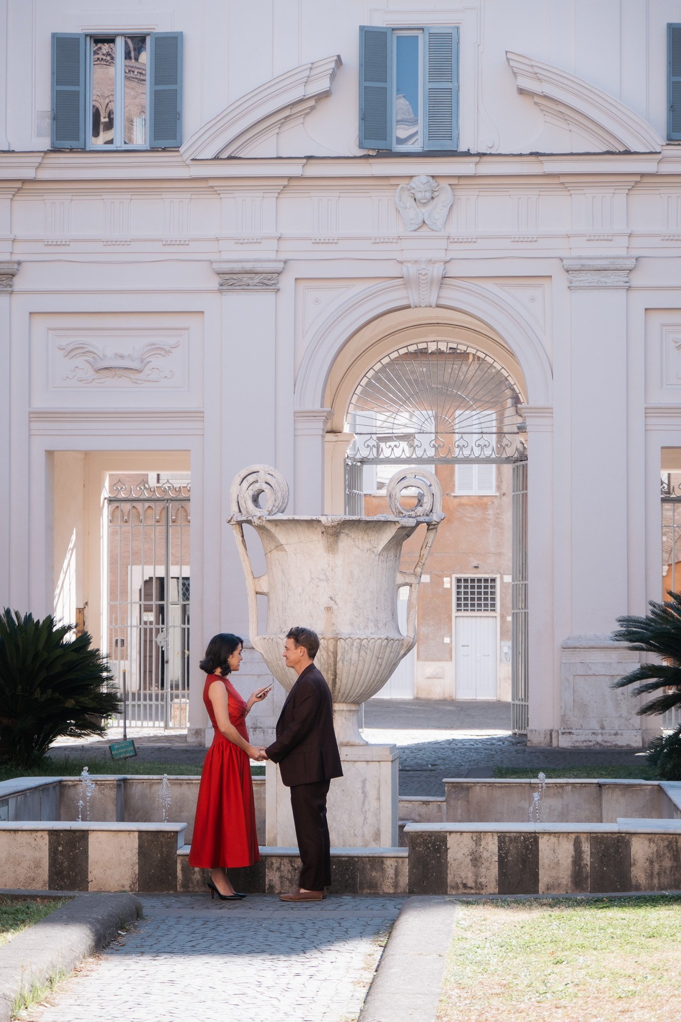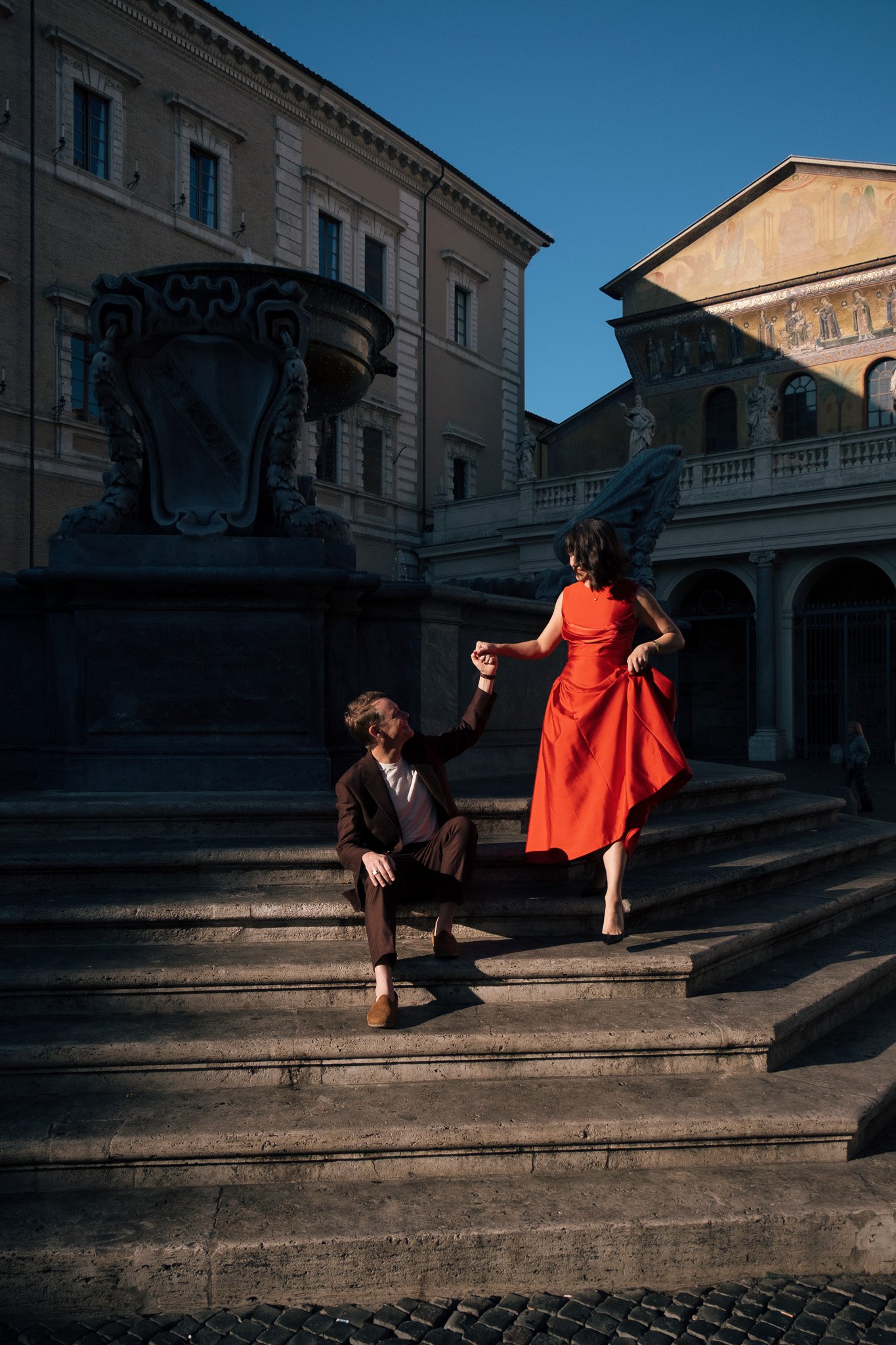 Proseguendo tra i vicoli di Trastevere, l’abito rosso di Katherine risaltava meravigliosamente sui toni delicati delle facciate romane. La calma di J bilanciava perfettamente l’energia della giornata. Le loro risate rimbalzavano tra i sampietrini mentre io catturavo momenti spontanei e ritratti più composti, alternando digitale e pellicola per raccontare la loro storia d’amore con autenticità.