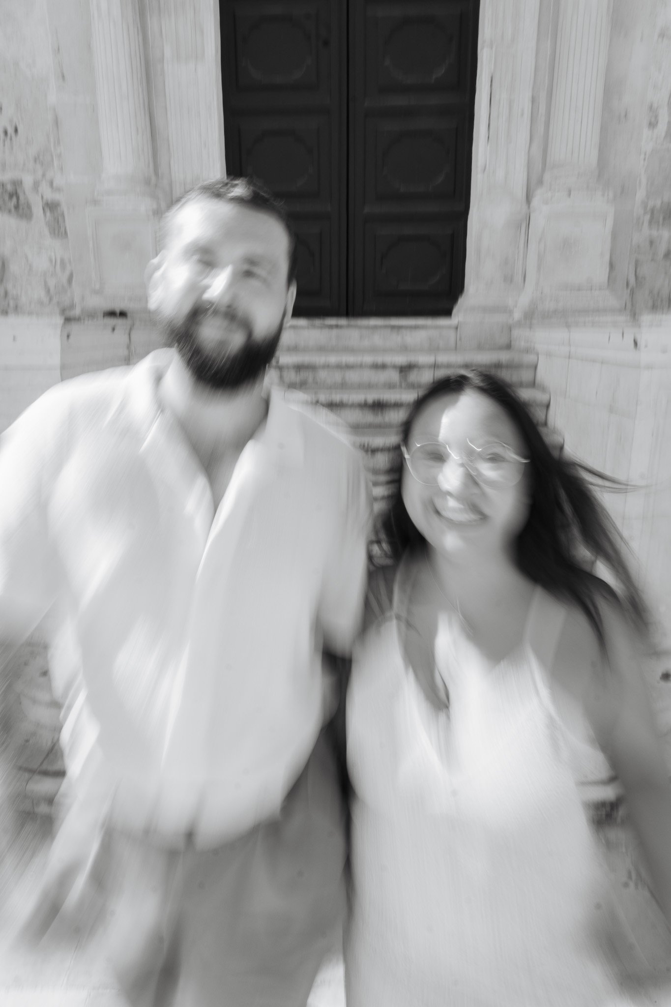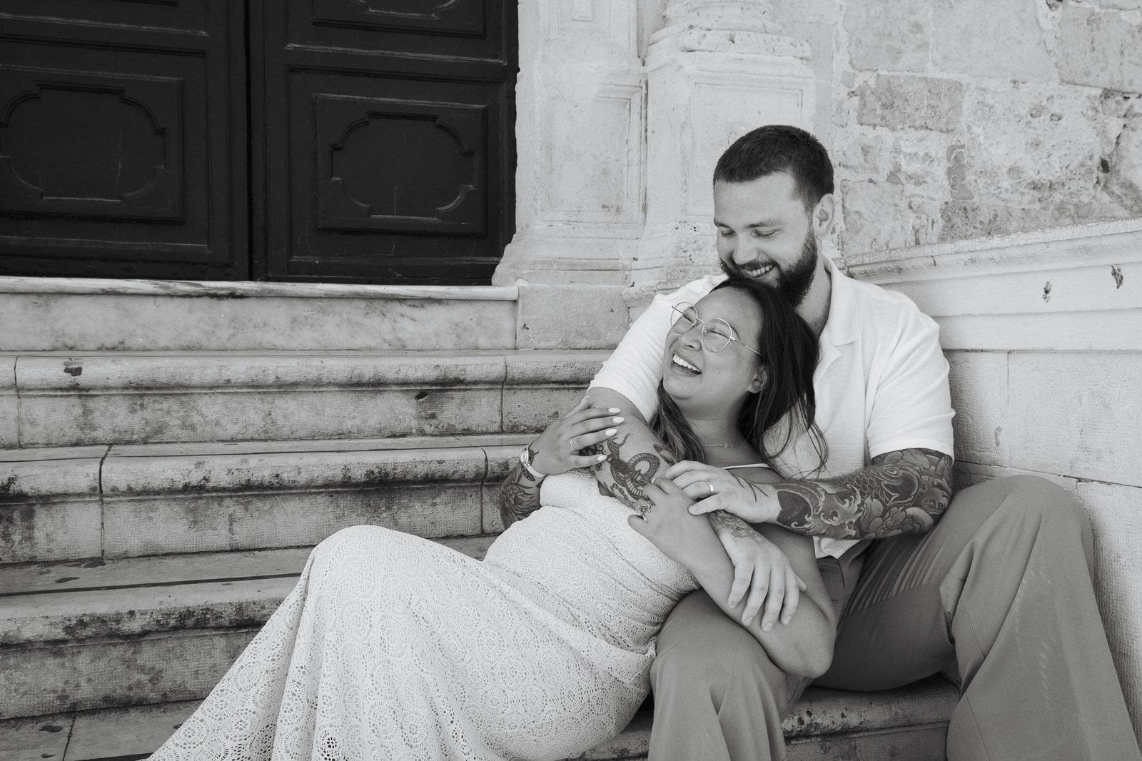 Ed è proprio lì che è iniziata la seconda parte della nostra avventura: tra le vie del centro storico, scovando angoli nascosti e muri pieni di pietre antiche che diventavano lo sfondo perfetto. In un punto, Matthew ha sollevato Gigi da terra, e i suoi capelli sono volati nell’aria mentre lei allargava le braccia ridendo, come se stesse volando davvero. In un altro, si sono seduti sui gradini di una vecchia chiesa, avvolti l’uno nelle braccia dell’altra, con sorrisi così grandi che quasi mi sembrava di entrare in un momento troppo intimo.