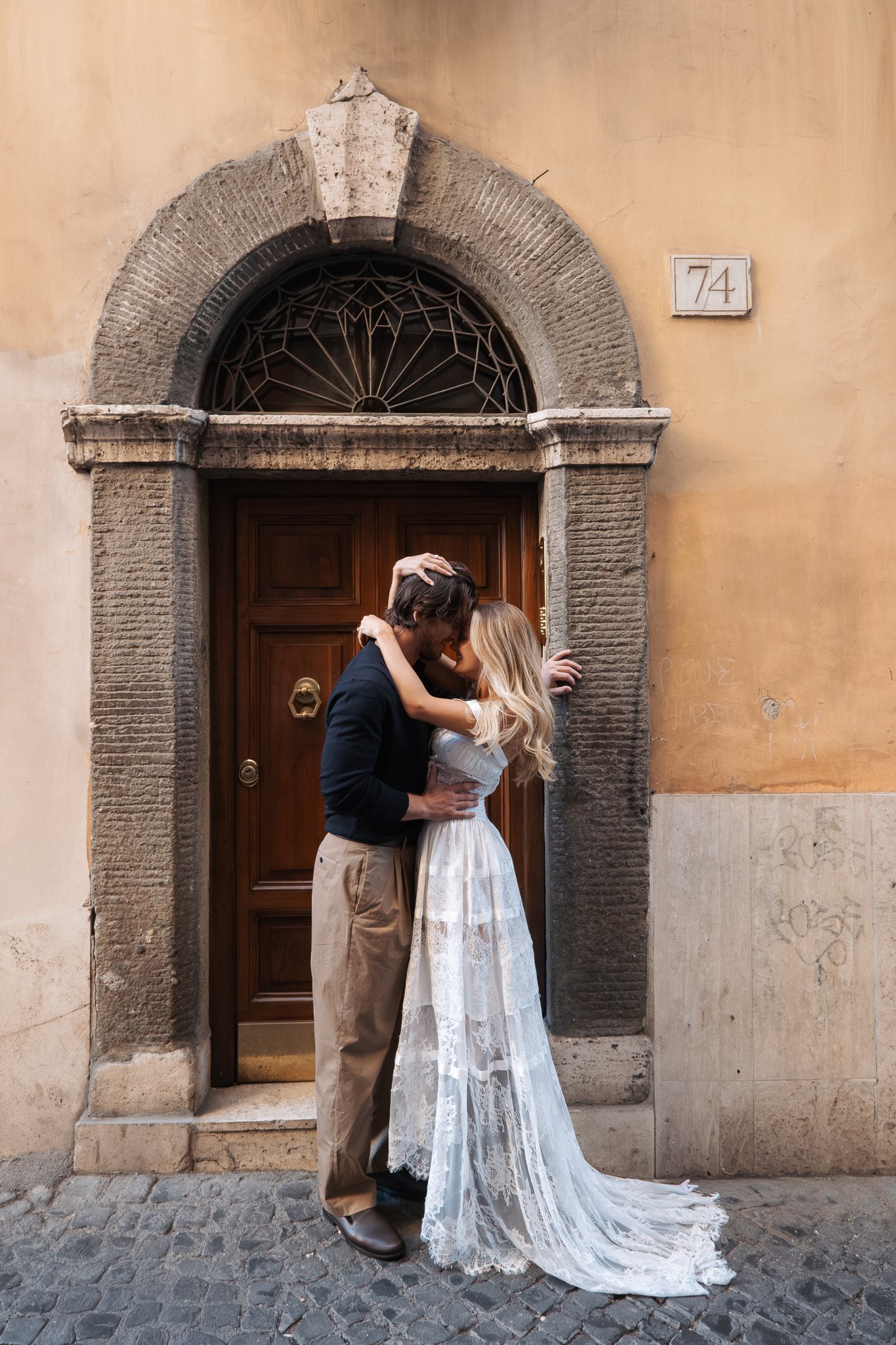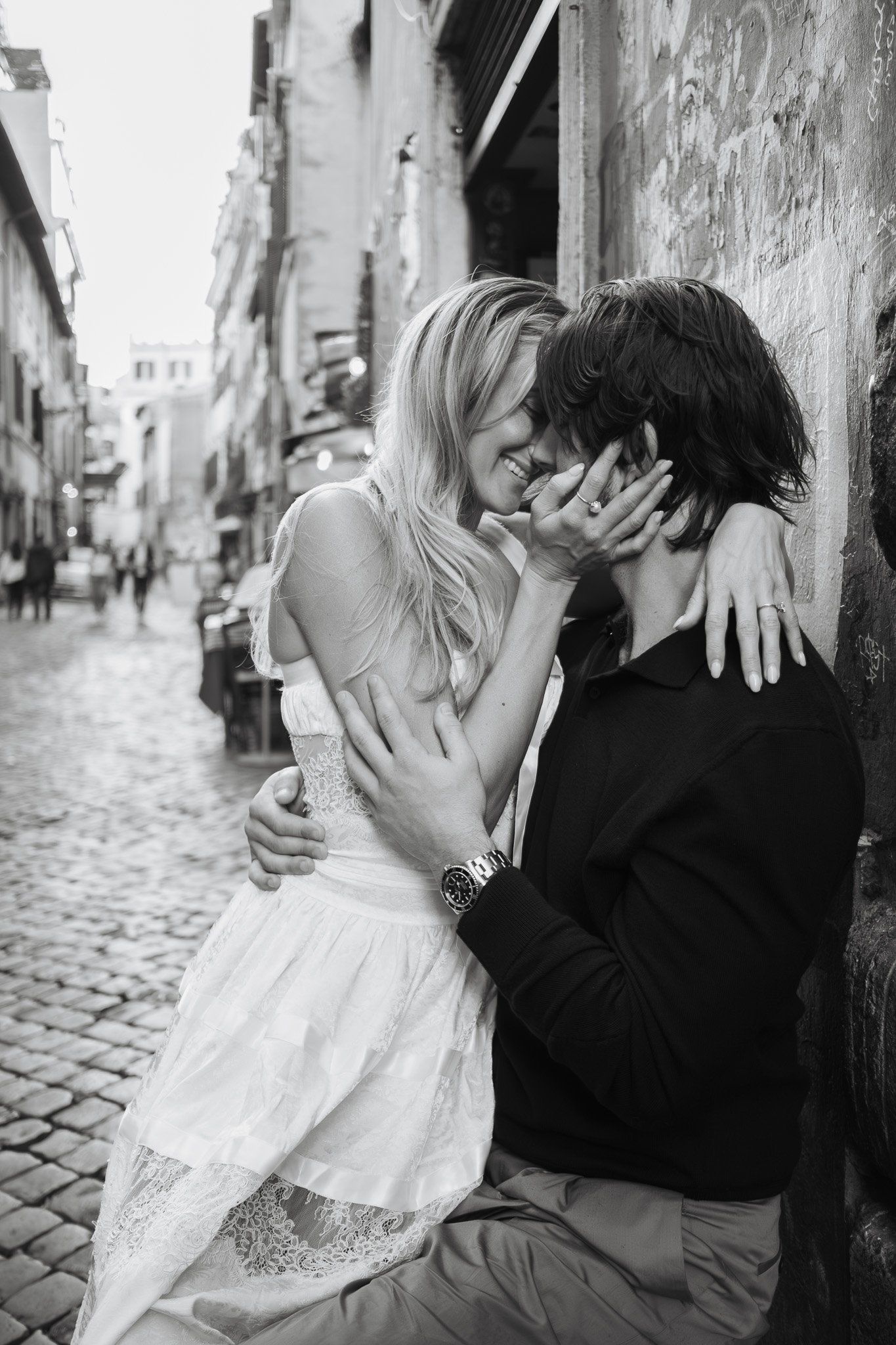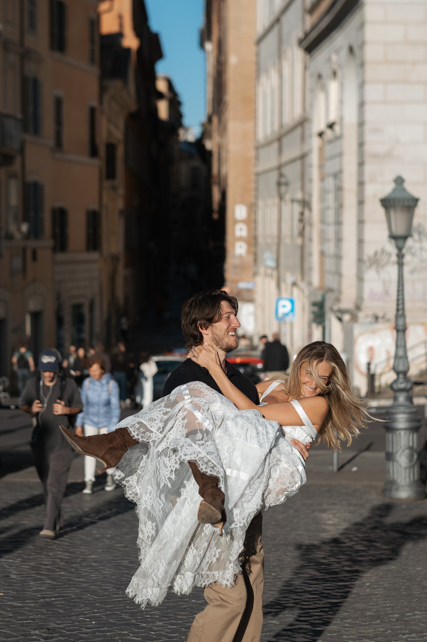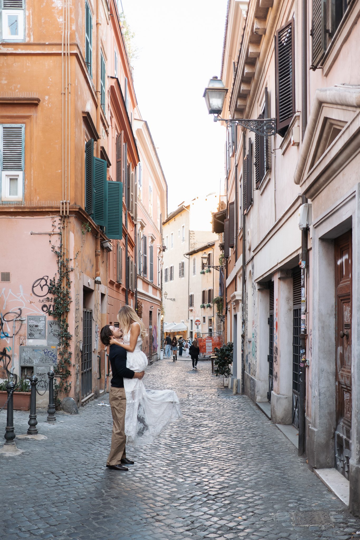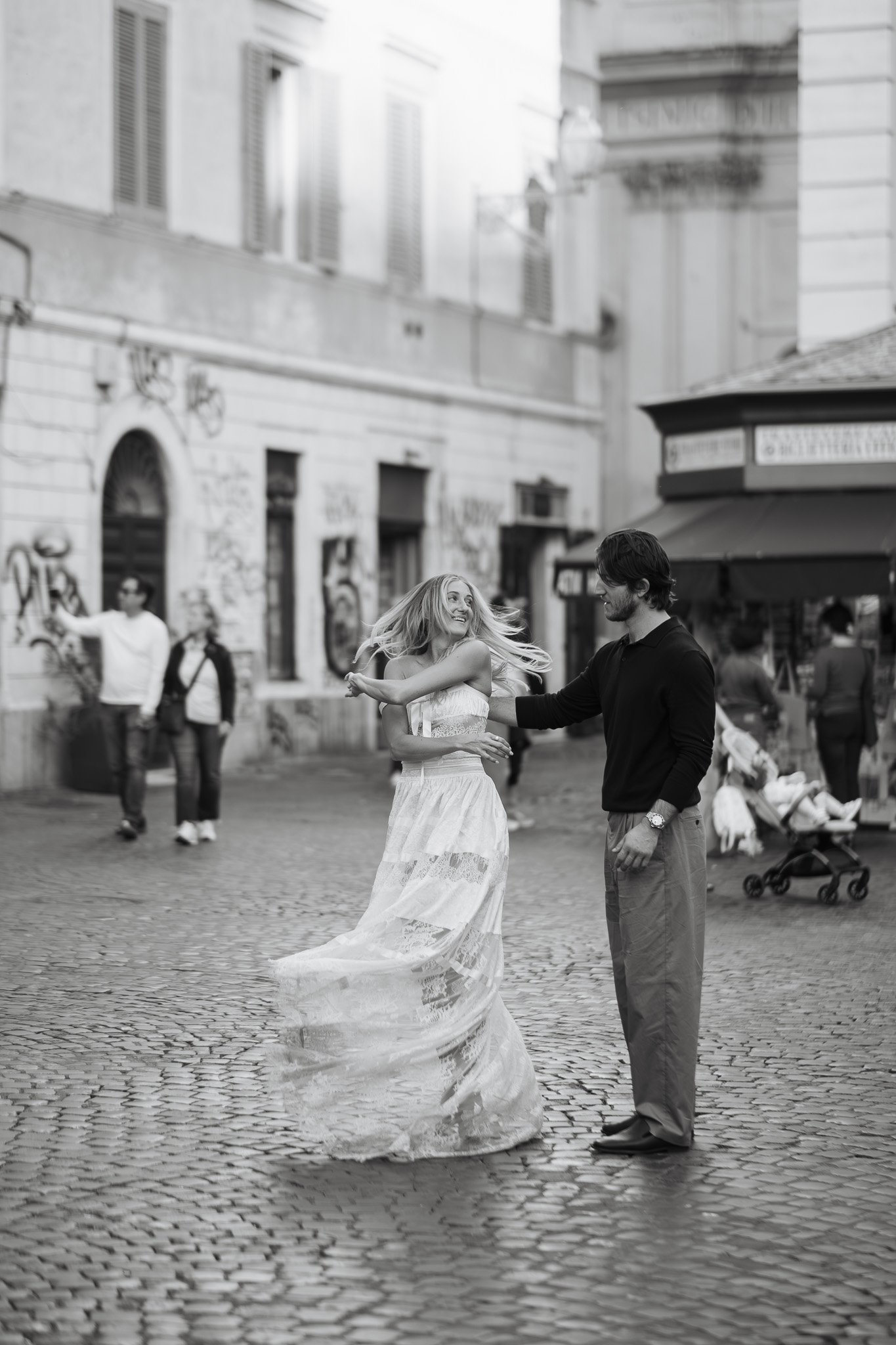Jessica non smetteva di ridere, e ogni pochi minuti saltava tra le braccia di Matthew. Le persone che passavano sorridevano, qualcuno applaudiva, e tutti ridevamo insieme. È proprio questo che amo del fotografare coppie a Roma: la città ha il dono di rendere ogni momento una piccola festa condivisa.