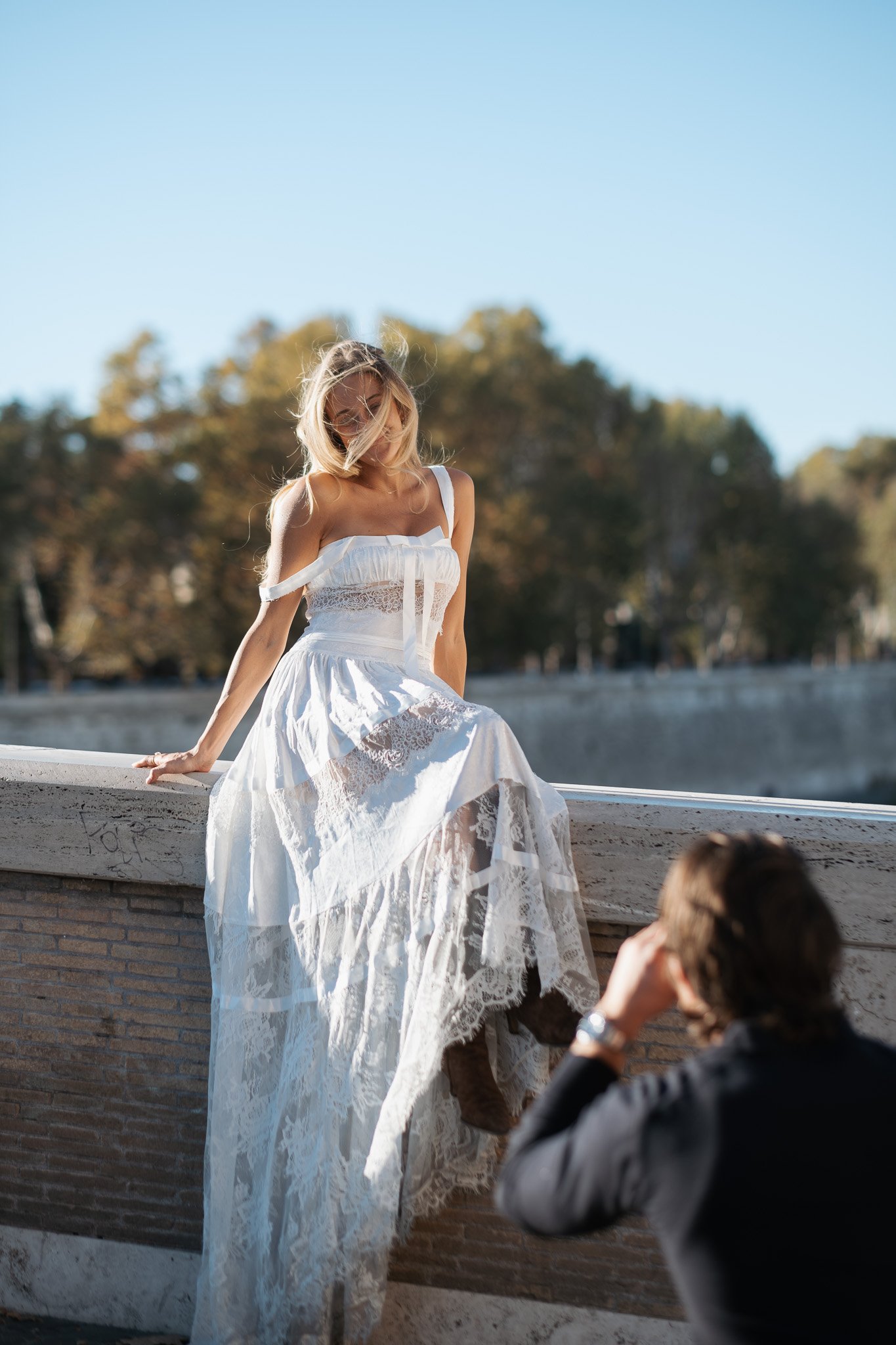 One thing I’ve learned as a wedding and engagement photographer in Italy is that the most memorable photos often happen when people forget about the camera. Jessica, a little tipsy and laughing freely, became even more expressive, so I played with motion blur and softer focus, reflecting her carefree mood. Those moments, unplanned and imperfect, turned out to be the most beautiful frames from the day. This is what I love most about engagement photography in Rome. It’s not only about iconic landmarks or classic poses. It’s about movement, laughter, and emotion; about creating a visual story that feels alive and true.