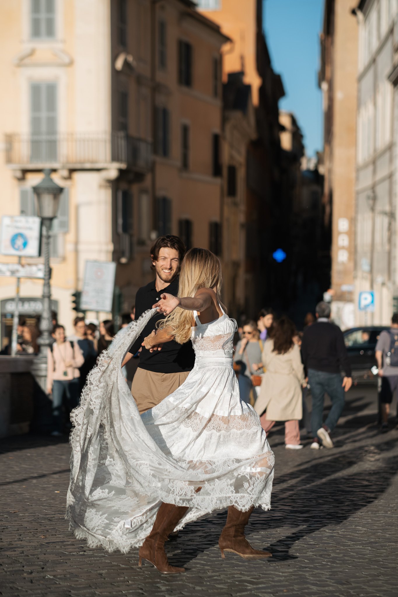 Jessica couldn’t stop laughing, and every few minutes she’d jump into Matthew’s arms. The people passing by smiled, some even clapped, and we all laughed together. That’s one of the reasons I love photographing couples in Rome: the city has this natural way of turning every moment into a shared celebration.