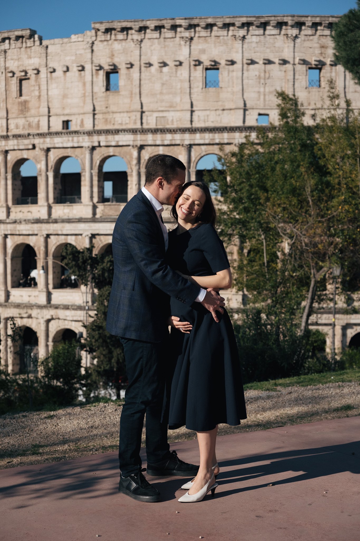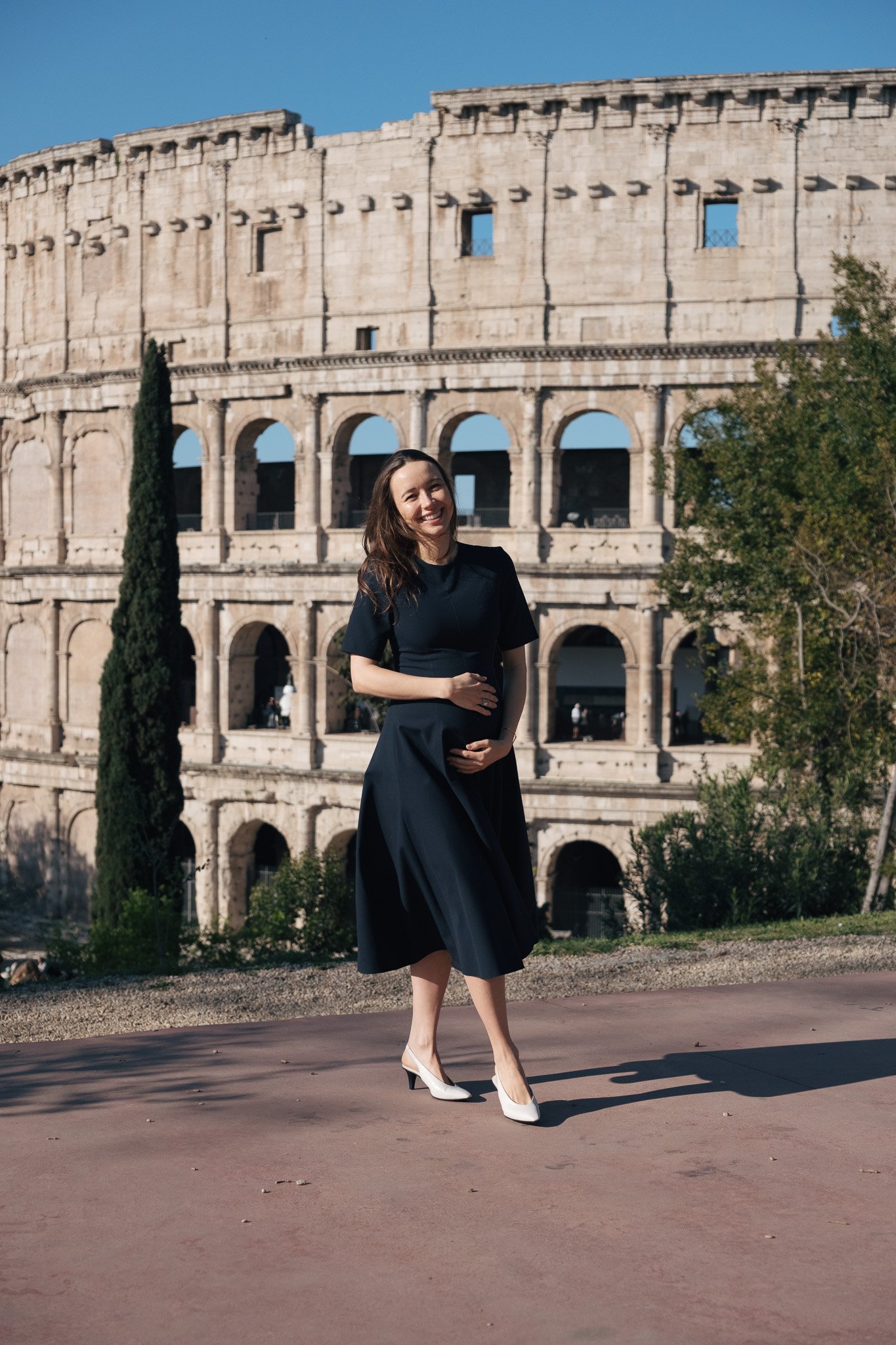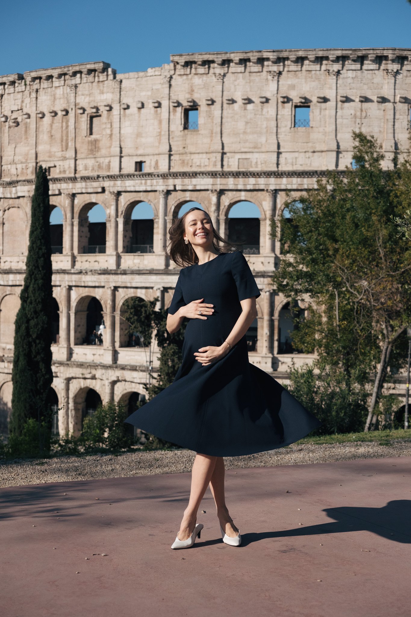 We stayed around the Colosseum, moved slowly, stopped when something felt right. No fixed route, no checklist. Just small moments. A look, a pause, a hand resting gently on her belly. At some point, I asked Charleen to spin a little. Just to catch a bit of air in the dress. Nothing complicated. And it turned into one of those frames where movement does more than posing ever could.