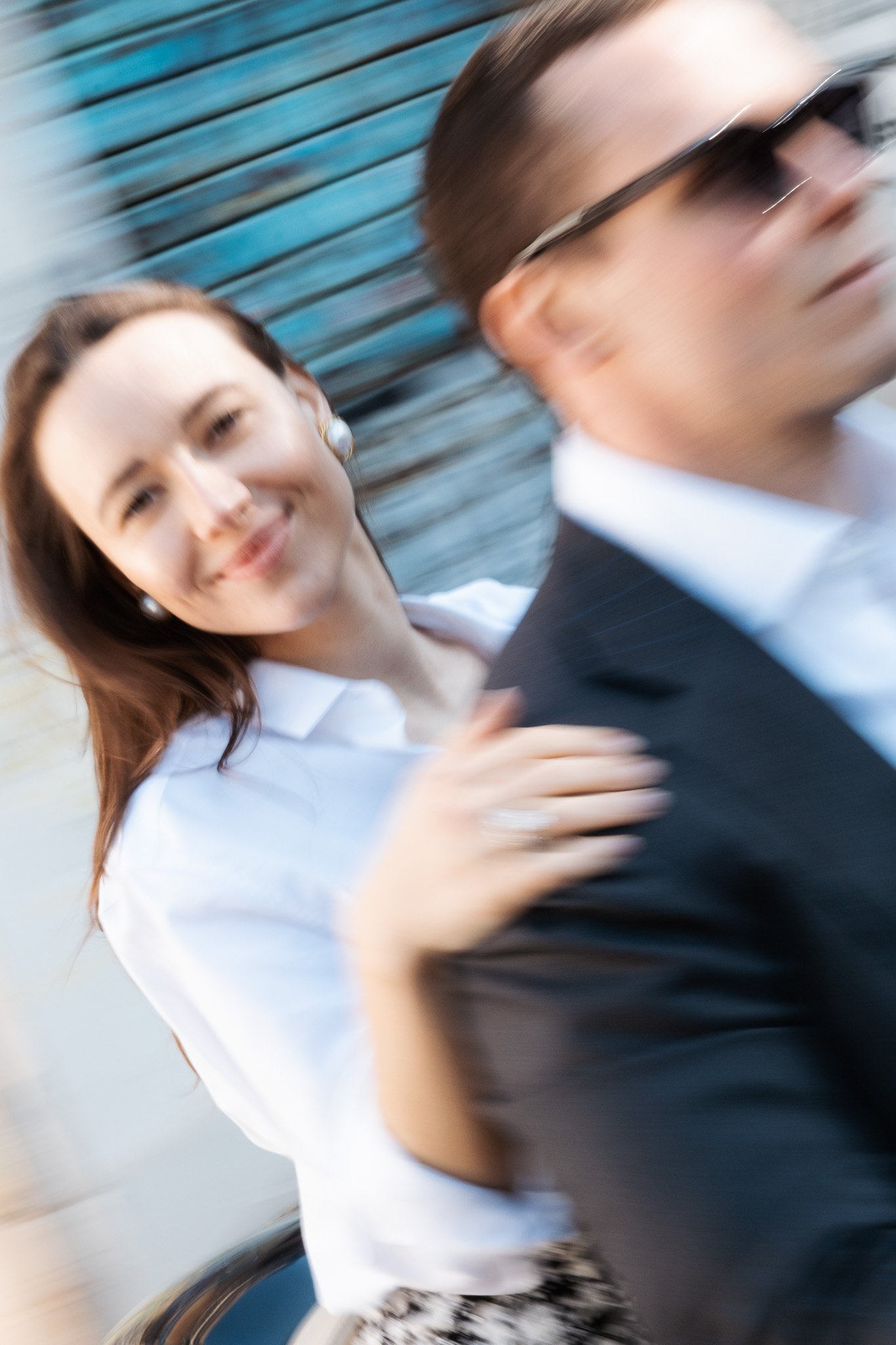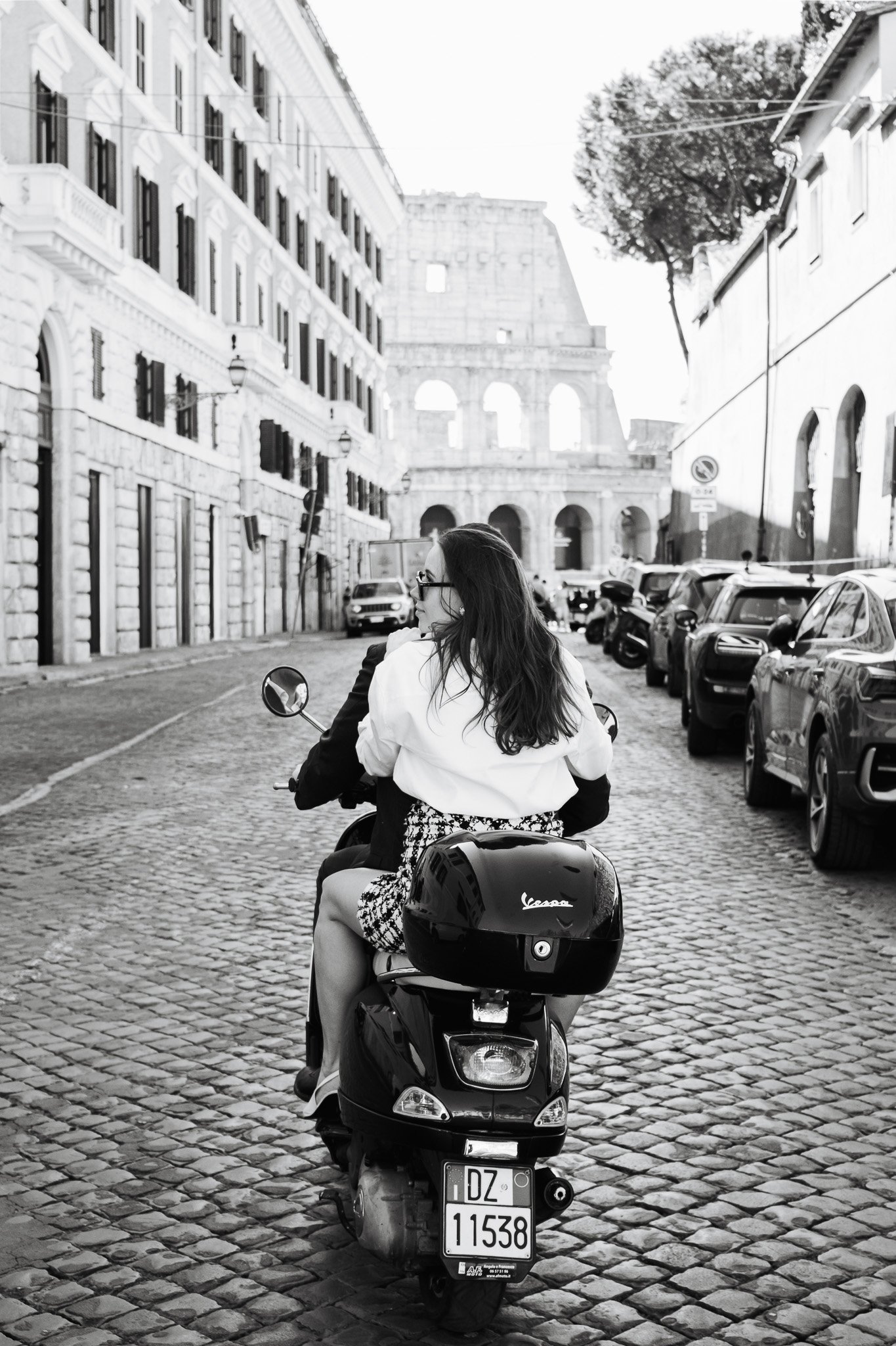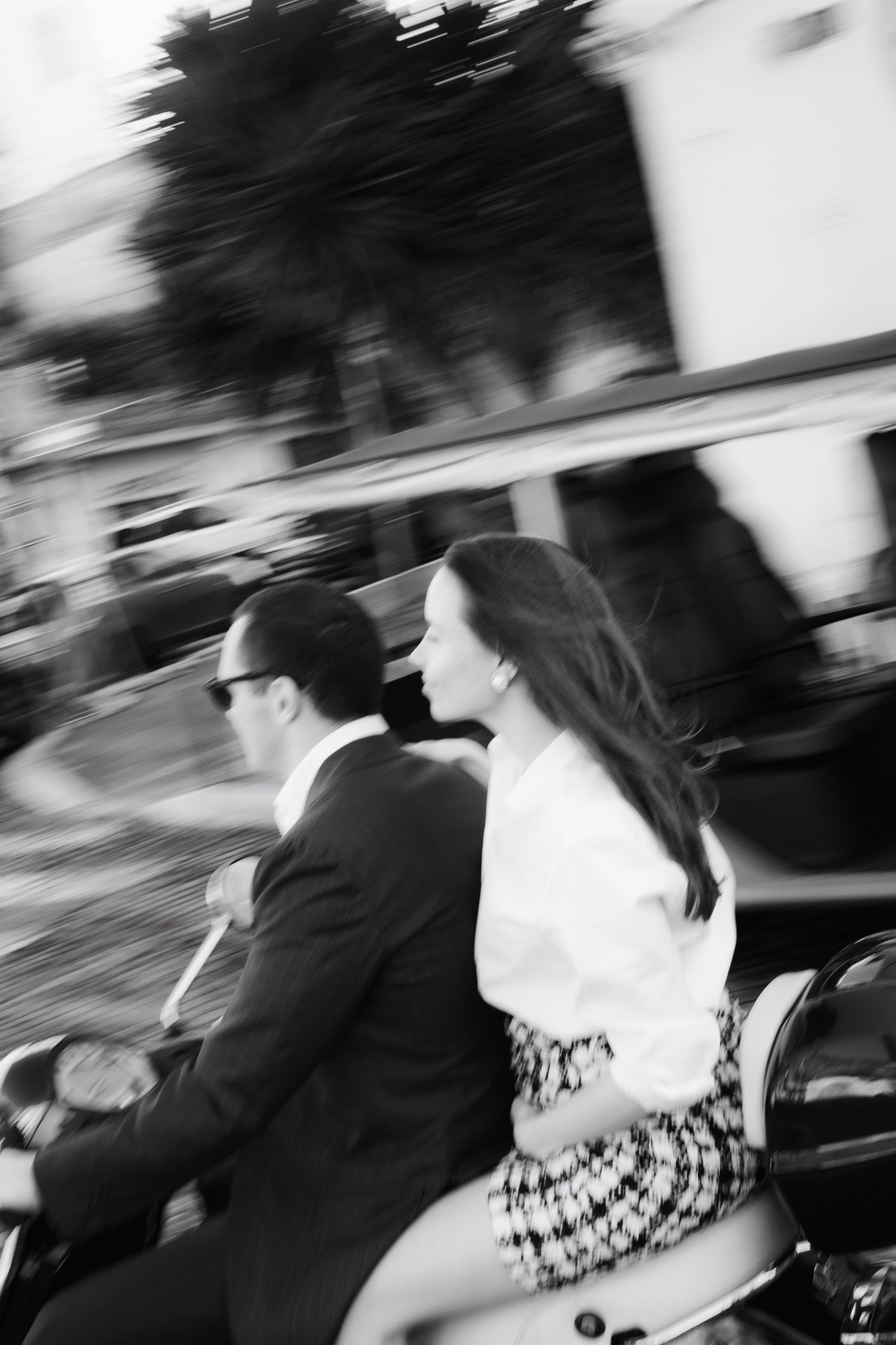 After a while, we paused. A short break, a change of clothes, a reset. These small interruptions often shape the rhythm of a photoshoot more than anything else. They make the second part feel different, lighter. That’s when we brought in the Vespa. There’s something about a Vespa in Rome that doesn’t feel staged. It just belongs. We didn’t overthink it. No strict direction. Just them riding through the streets, adjusting naturally, finding their balance. The city moving around them, not against them. Some frames were sharp, others blurred. I kept both. Because not everything needs to be perfectly still to feel real. The movement, the noise, the unpredictability… it all became part of the story.
