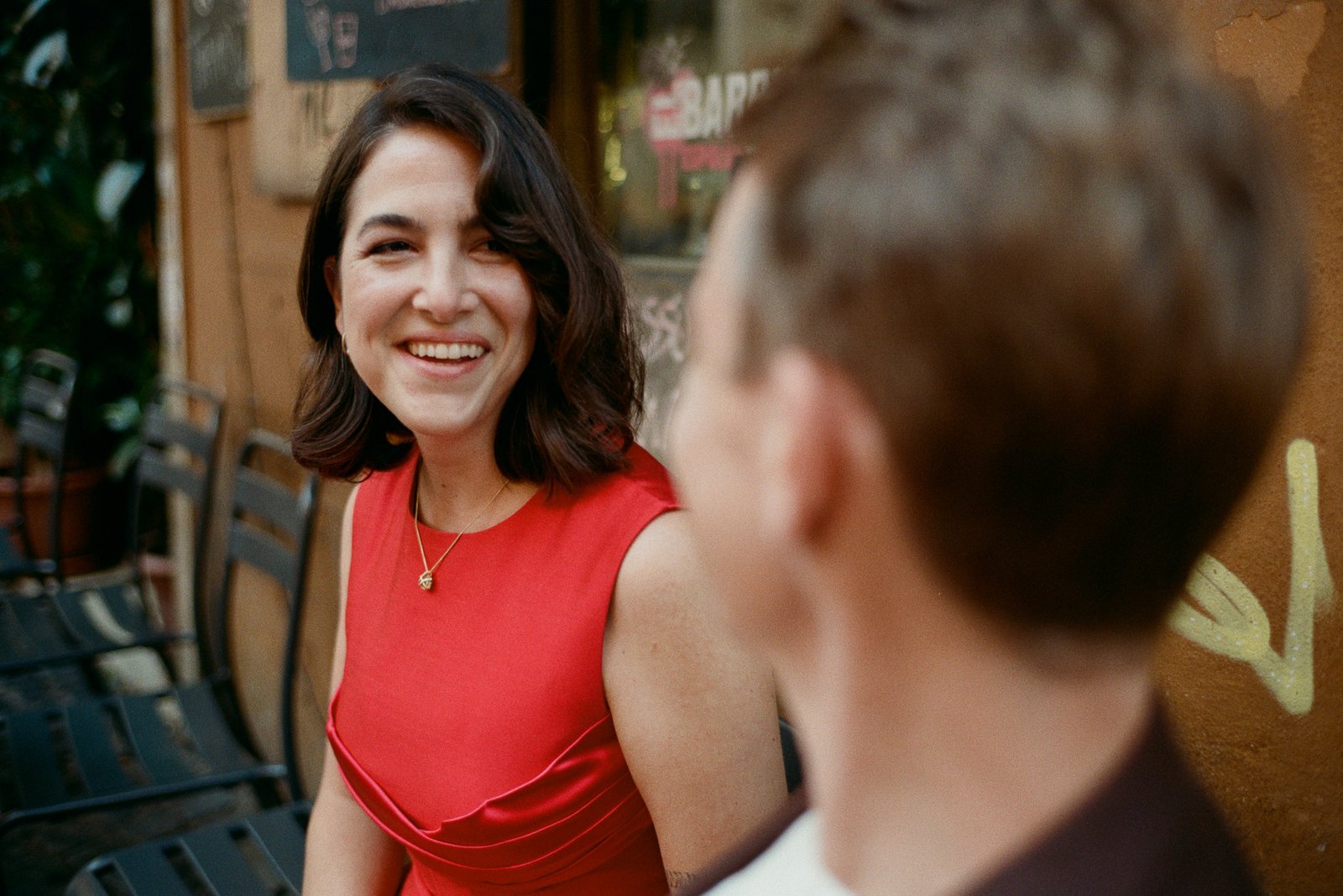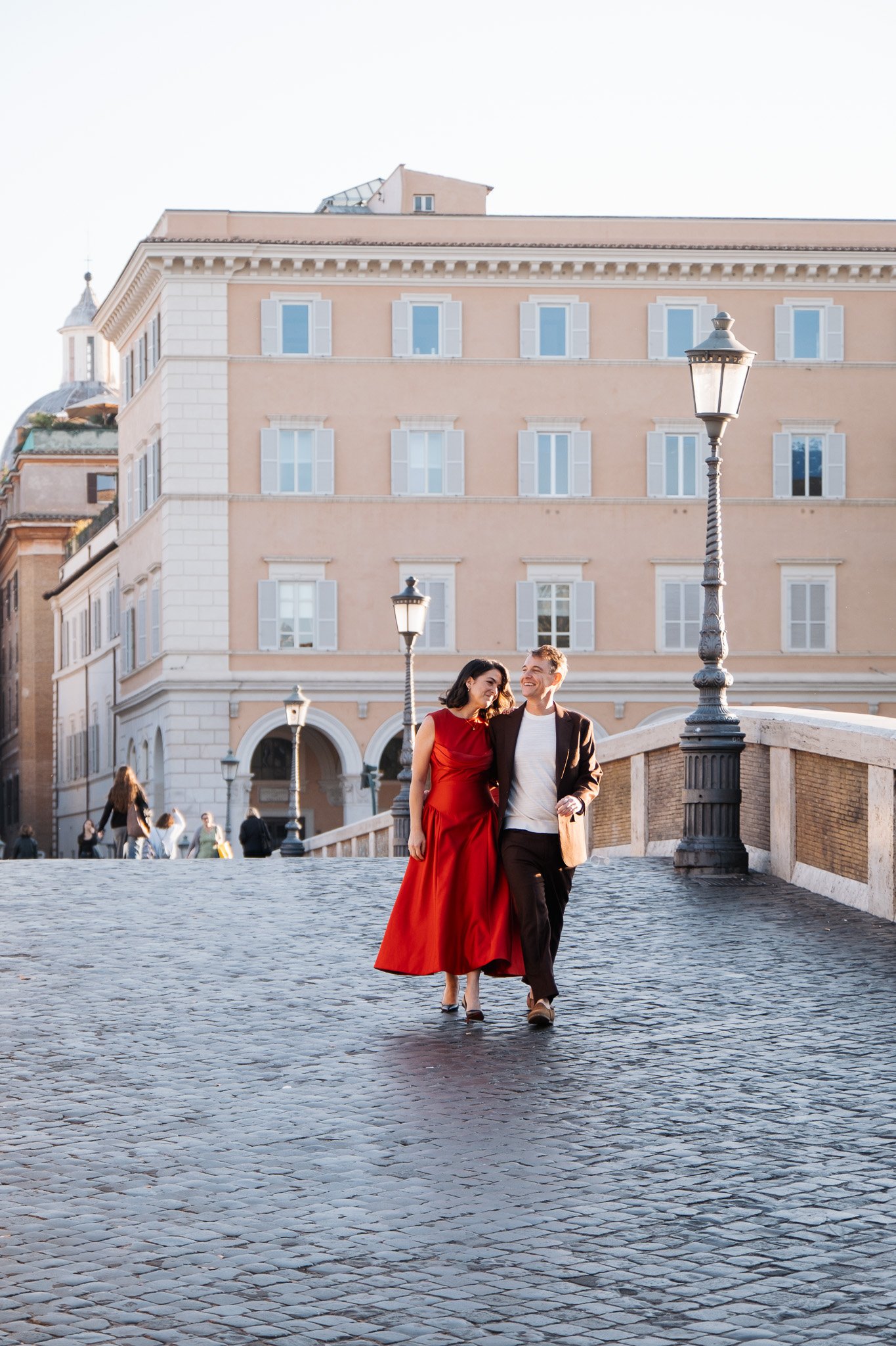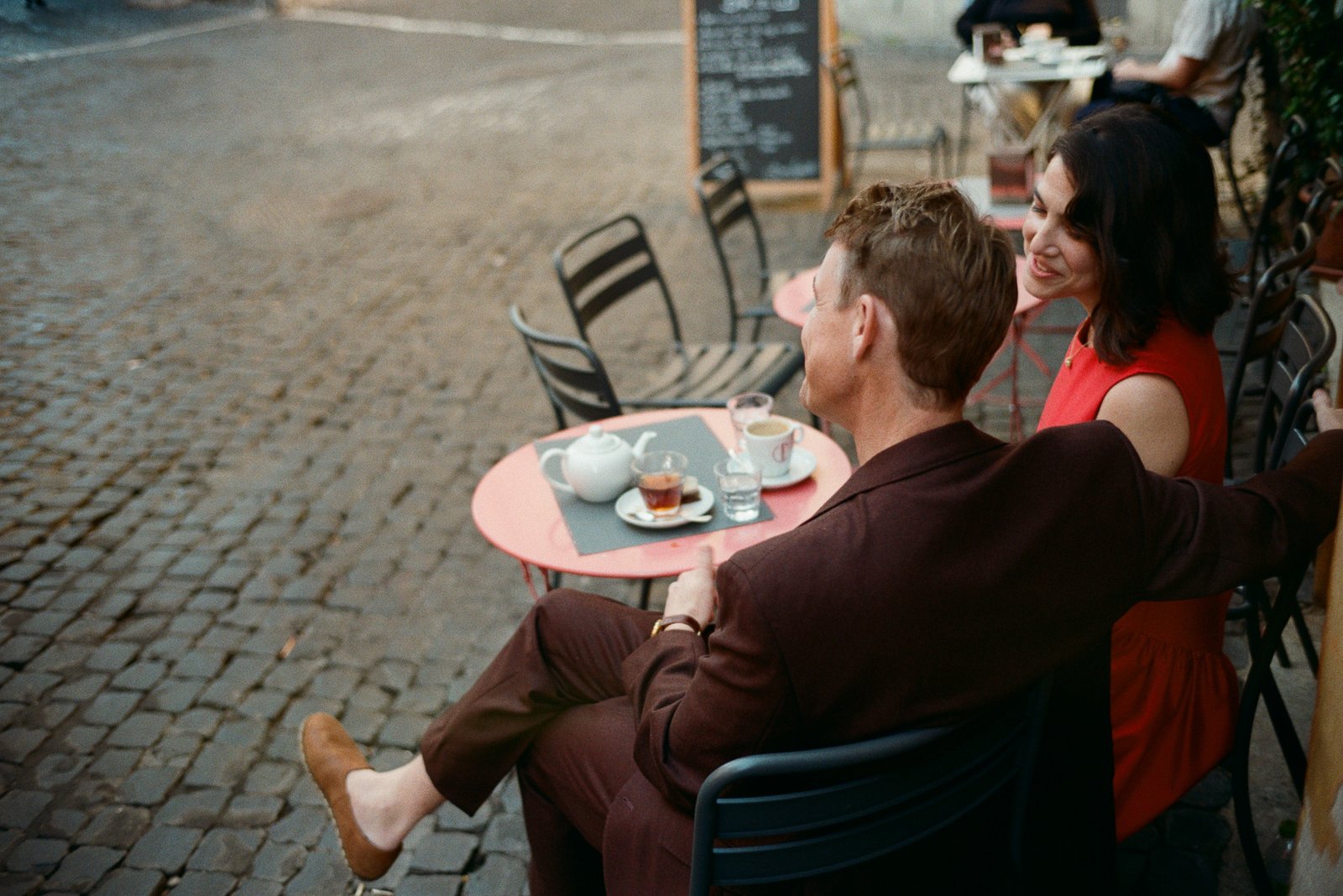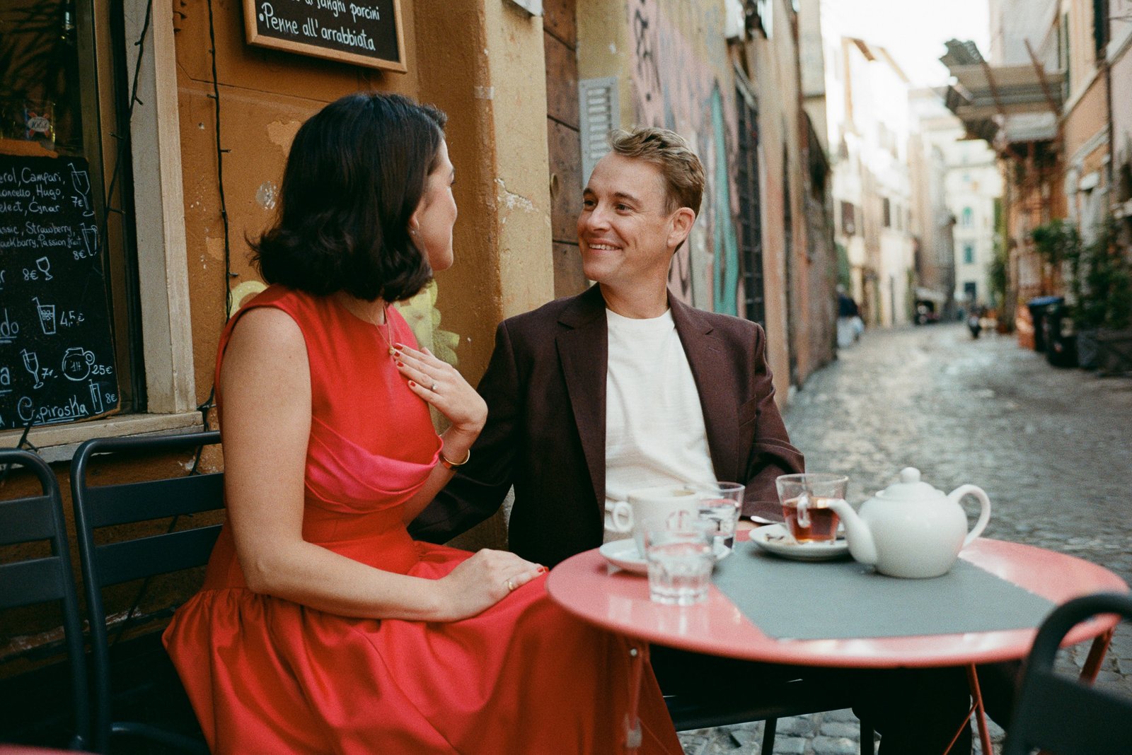 As we continued through Trastevere’s cobblestone alleys, Katherine’s red dress contrasted beautifully with the soft Roman tones. J’s calm presence balanced the energy of the day. Their laughter echoed through the narrow streets while I captured both candid and composed frames on film and digital.